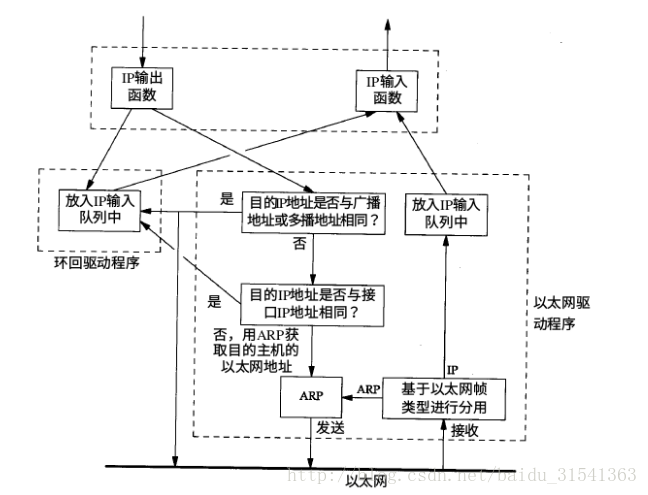 当网络层的IP输出函数发现目的地址为环回地址,则交给环回驱动程序,环回驱动程序把该IP数据包放入IP输入队列中。否则则交给以太网驱动程序。