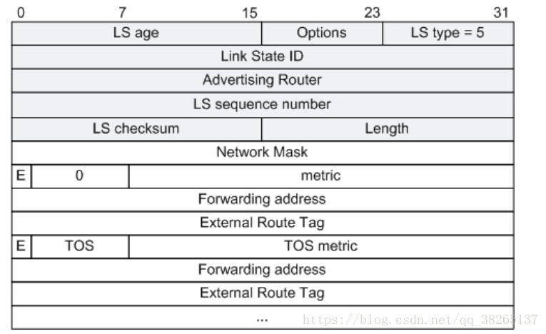 | External Route Tag | 32比特 | 添加到外部路由上的标记。OSPF本身并不使用这个字段,它可以用来对外部路由进行管理。 |