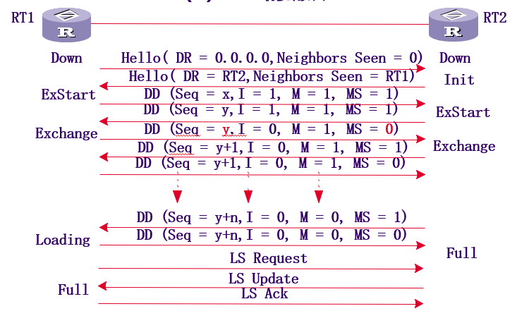 DD:Database Description 本地数据库摘要,供路由器核对数据库是否同步。只交换摘要,减少带宽占用。包括空DD报文和带有摘要信息的DD报文。空DD报文用来确定Master/Slave关系,由Master规定起始序列号,每发送一个DD报文序列号加1,Slave方使用Master的序列号作为确认。