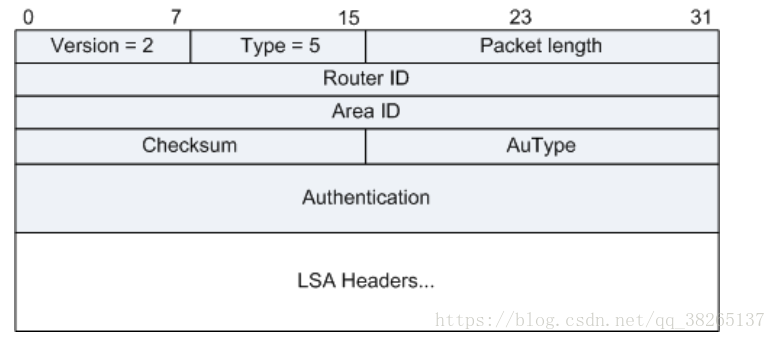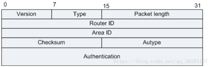 | Authentication | 8字节 | 鉴定字段,其数值根据验证类型而定。当验证类型为0时未作定义;类型为1时此字段为密码信息;类型为2时此字段包括Key ID、MD5验证数据长度和序列号的信息。MD5验证数据添加在OSPF报文后面,不包含在Authenticaiton字段中。 |