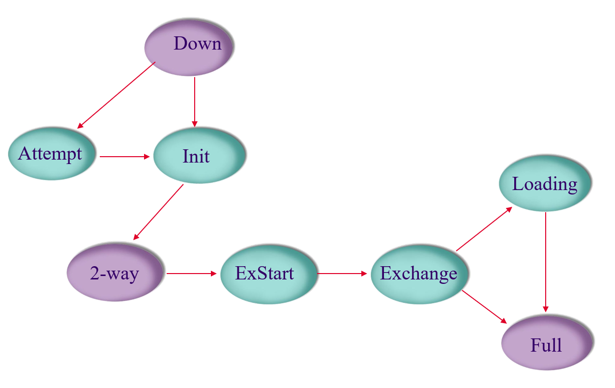 - 当双方成功交换链路状态通告信息后才会成为邻接关系。建立了逻辑上的邻接关系。