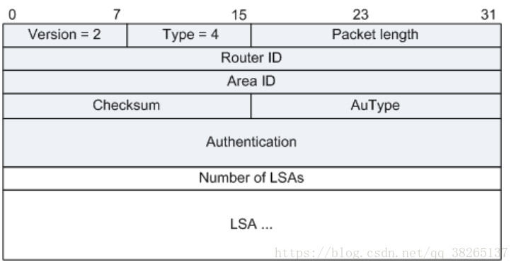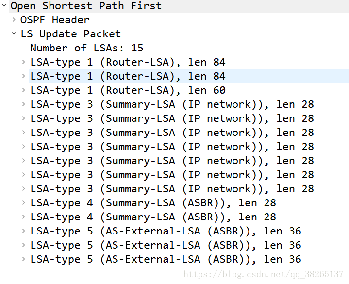 LSU:Link-State Update 链路状态更新,用来向对端Router发送其所需要的LSA或者泛洪自己更新的LSA,内容是多条LSA(全部内容)的集合。LSU包括几种类型的LSA,LSU负责泛洪LSA,和响应LSR。LSA只会发送给之前以LSR请求的LSA的直连邻居,进行泛洪的时候,邻居路由负责把收到的LSA信息重新封装在新的LSU中。