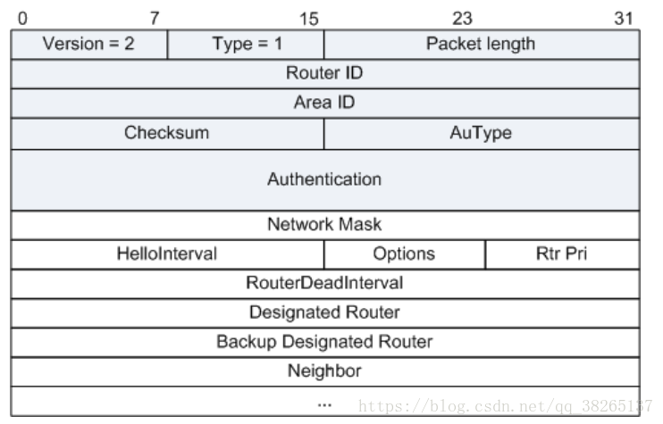 | Backup Designated Router | 32比特 | BDR的接口地址。 |