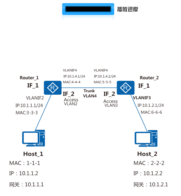 互访的源主机Host_1和目的主机Host_2连接在不同的设备Router_1和Router_2上,分别属于VLAN2和VLAN3,并位于不同的网段。在Router_1上分别创建VLANIF2和VLANIF4,配置其IP地址为10.1.1.1和10.1.4.1;在Router_2上分别创建VLANIF3和VLANIF4,配置其IP地址为10.1.2.1和10.1.4.2,并在Router_1和Router_2上分别配置静态路由。Router_1上静态路由的目的网段是10.1.2.0/24,下一跳是10.1.4.2;Router_2上静态路由的目的网段是10.1.1.0/24,下一跳是10.1.4.1。