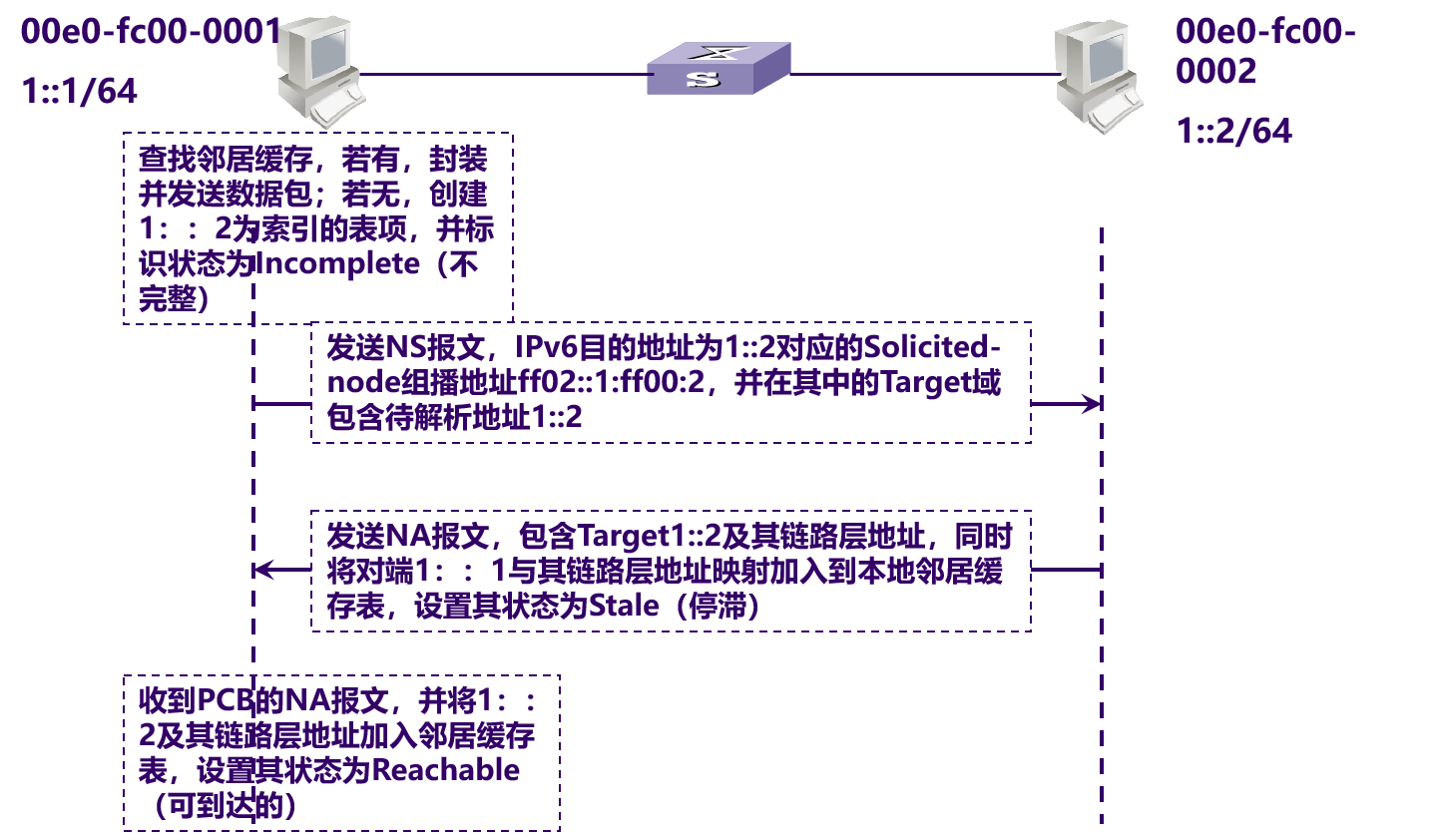 - A先发送NS报文,并生成缓存条目,此时,邻居状态为Incomplete。
