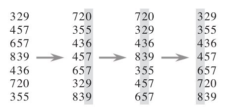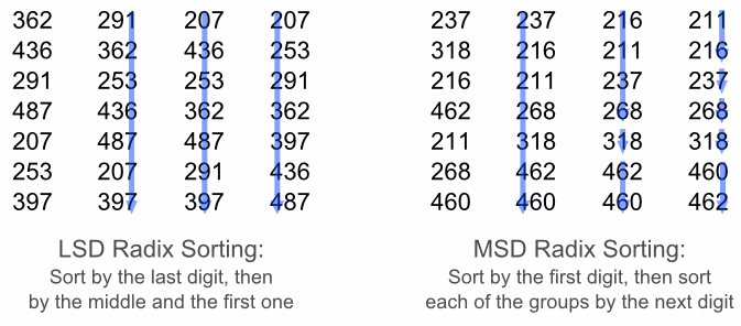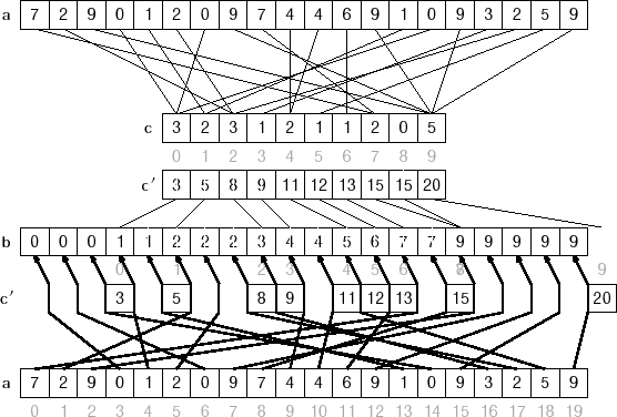 1 class Program 2 { 3 static void Main(string[] args) 4 { 5 int[] unsorted = 6 { 7 15, 19, 13, 19, 10, 33, 12, 14, 13, 10, 8 }; 9 10 RadixSort(unsorted); 11 12 foreach (var key in unsorted) 13 { 14 Console.Write("{0} ", key); 15 } 16 17 Console.Read(); 18 } 19 20 static void RadixSort(int[] unsorted) 21 { 22 // our helper array 23 int[] t = new int[unsorted.Length]; 24 25 // number of bits our group will be long 26 // try to set this also to 2, 8 or 16 to see if it is quicker or not 27 int r = 4; 28 29 // number of bits of a C# int 30 int b = 32; 31 32 // counting and prefix arrays 33 // (note dimensions 2^r which is the number of 34 // all possible values of a r-bit number) 35 int[] count = new int[1 << r]; 36 int[] pref = new int[1 << r]; 37 38 // number of groups 39 int groups = (int)Math.Ceiling((double)b / (double)r); 40 41 // the mask to identify groups 42 int mask = (1 << r) - 1; 43 44 // the algorithm: 45 for (int c = 0, shift = 0; c < groups; c++, shift += r) 46 { 47 // reset count array 48 for (int j = 0; j < count.Length; j++) 49 count[j] = 0; 50 51 // counting elements of the c-th group 52 for (int i = 0; i < unsorted.Length; i++) 53 count[(unsorted[i] >> shift) & mask]++; 54 55 // calculating prefixes 56 pref[0] = 0; 57 for (int i = 1; i < count.Length; i++) 58 pref[i] = pref[i - 1] + count[i - 1]; 59 60 // from a[] to t[] elements ordered by c-th group 61 for (int i = 0; i < unsorted.Length; i++) 62 t[pref[(unsorted[i] >> shift) & mask]++] = unsorted[i]; 63 64 // a[]=t[] and start again until the last group 65 t.CopyTo(unsorted, 0); 66 } 67 // a is sorted 68 } 69 }