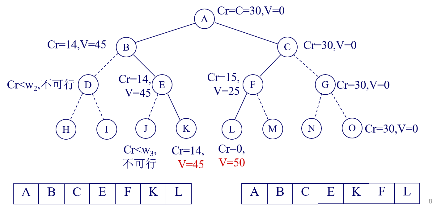 - 可行性约束函数(剪枝函数)$\sum w_ix_i\leq c_i$