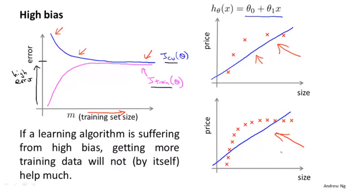 - 当训练集与交叉验证集的误差都很高时,误差主要由偏差引起。