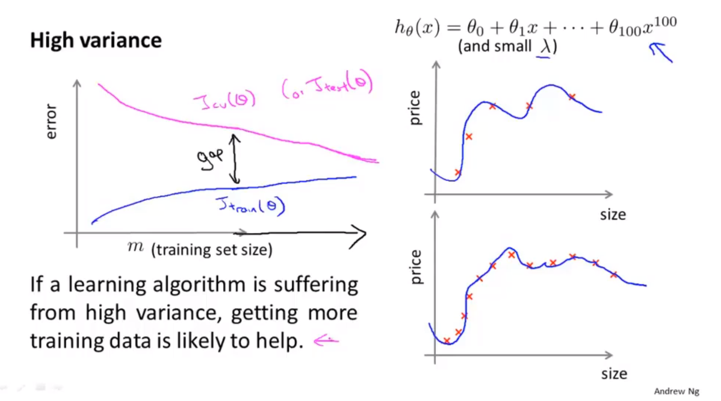 - 高方差学习曲线。随着样本数量的增多。训练集代价函数会增加,验证集代价函数会减小。二者的上下界,随着样本数量的增加不会迅速接近。