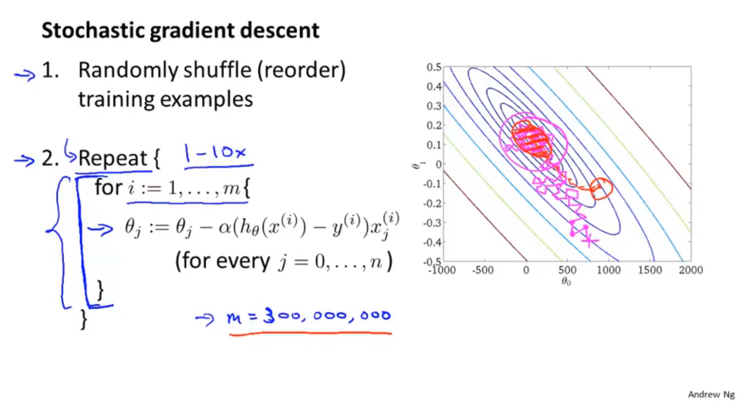 - 数据集很大的时候,普通梯度下降会变得困难。使用随机梯度下降,能够解决数据集过大的现象。