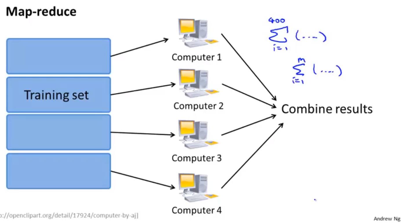 - map-reduce 过程,可以处理$\Sigma$累加的部分,通过reduce过程,对计算结果累计。必要条件:算法能够表示成对训练集的一种求和
