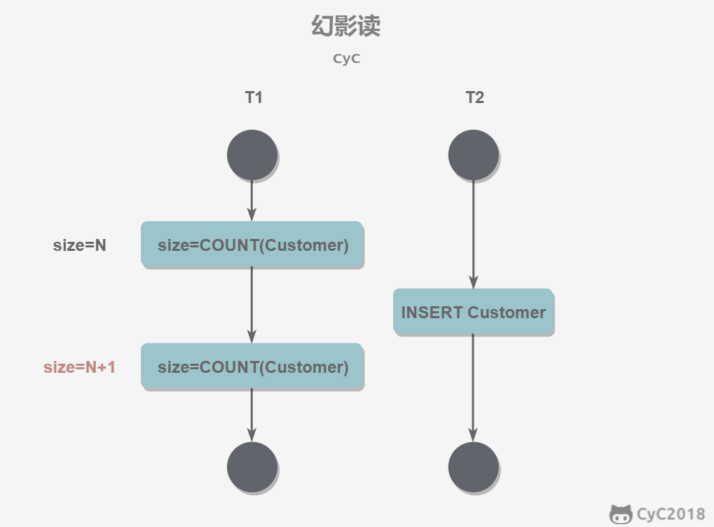 - 事务 A 按照一定条件进行数据读取, 期间事务 B 插入了相同搜索条件的新数据,事务 A 再次按照原先条件进行读取时,发现了事务 B 新插入的数据 称为幻读。幻读本质上也属于不可重复读的情况,T1 读取某个范围的数据,T2 在这个范围内插入新的数据,T1 再次读取这个范围的数据,此时读取的结果和和第一次读取的结果不同。