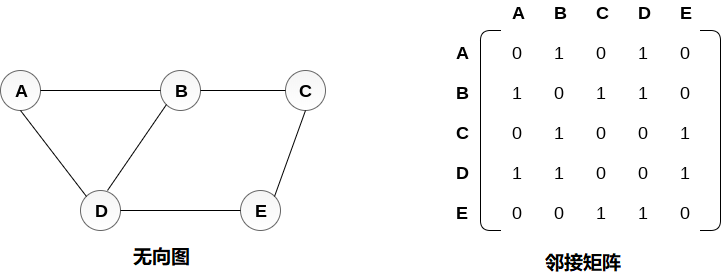 无向图及其邻接矩阵表示如下图所示。