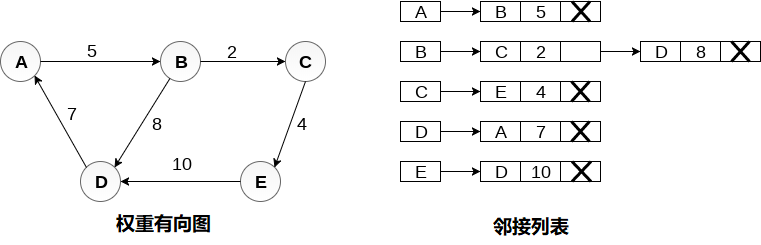 权重有向图以及邻接矩阵表示如下图所示。