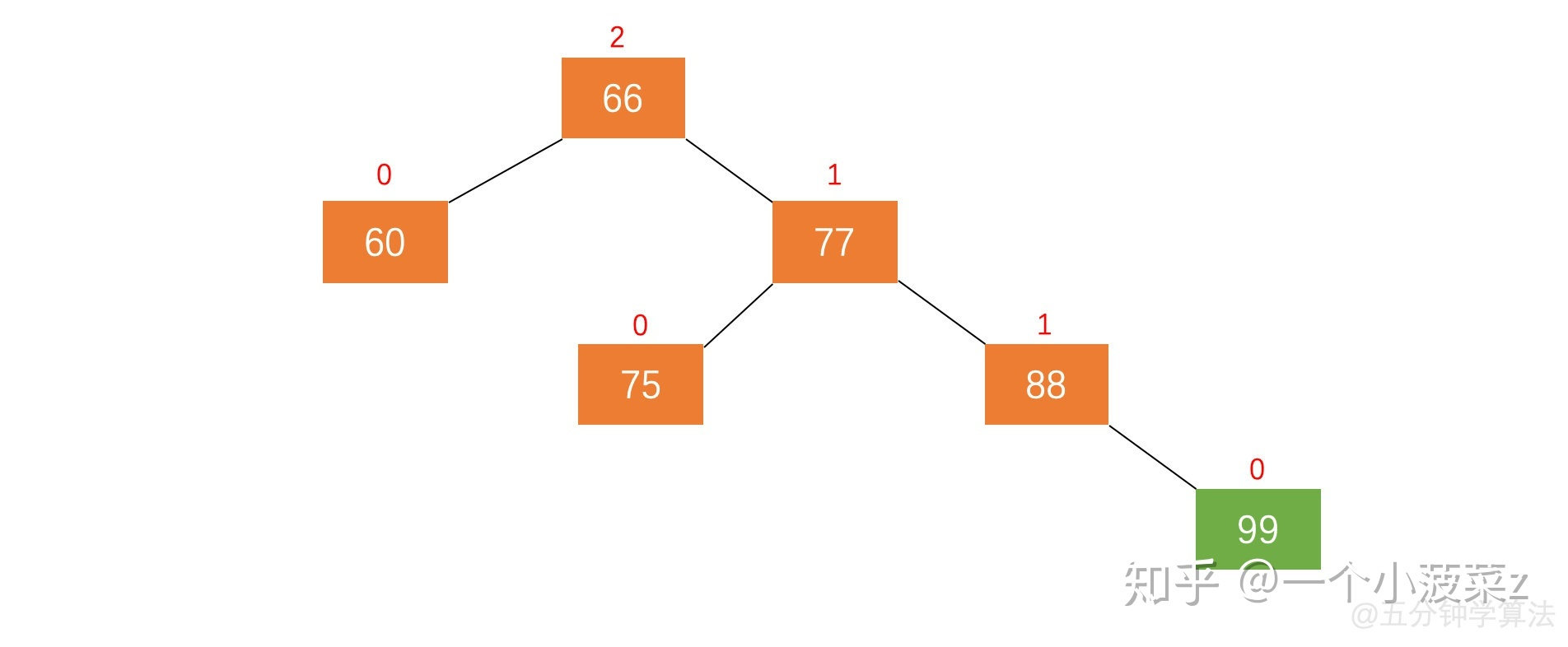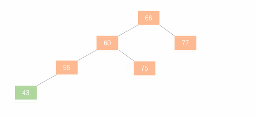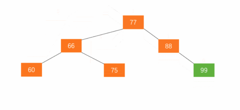 - 左旋。加入新节点 99 后,节点 66 的左子树高度为 1,右子树高度为 3,此时平衡因子为 -2。为保证树的平衡,此时需要对节点 66 做出旋转,因为右子树高度高于左子树,对节点进行左旋操作,