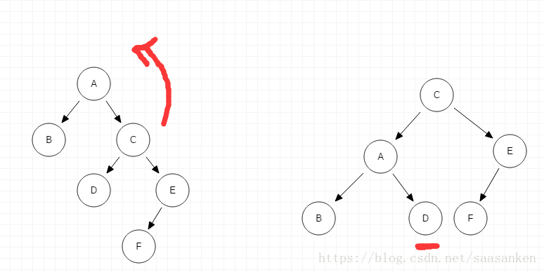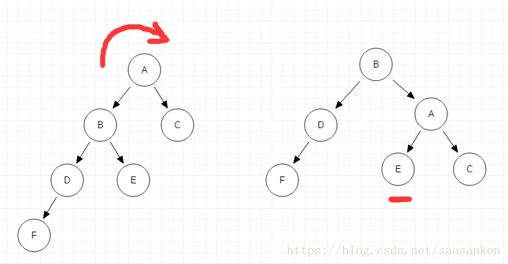 - 由于在A的左子树的根结点的左子树上插入结点F(LL),需进行一次的向右的顺时针旋转操作