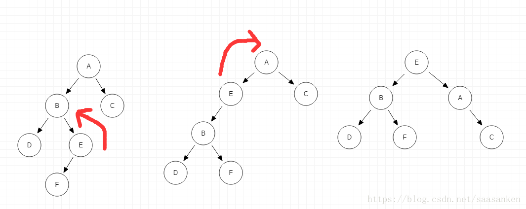 - 在 A 的右子树的根节点的左子树上插入节点F而破坏平衡。需要先进行子树右旋,然后进行A节点的左旋。
