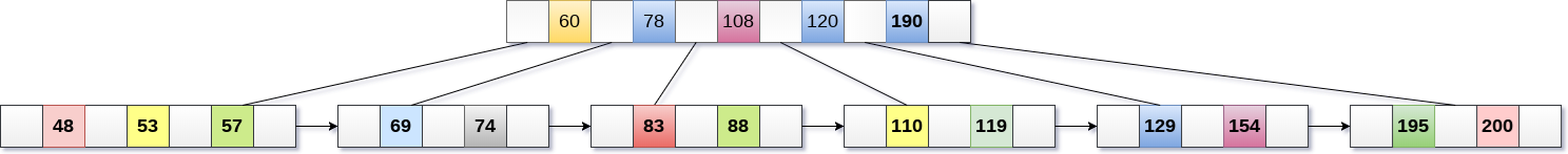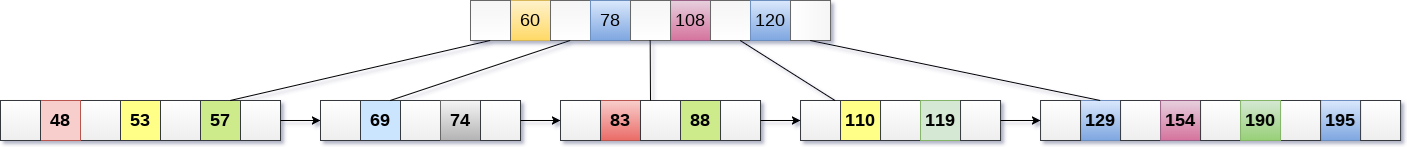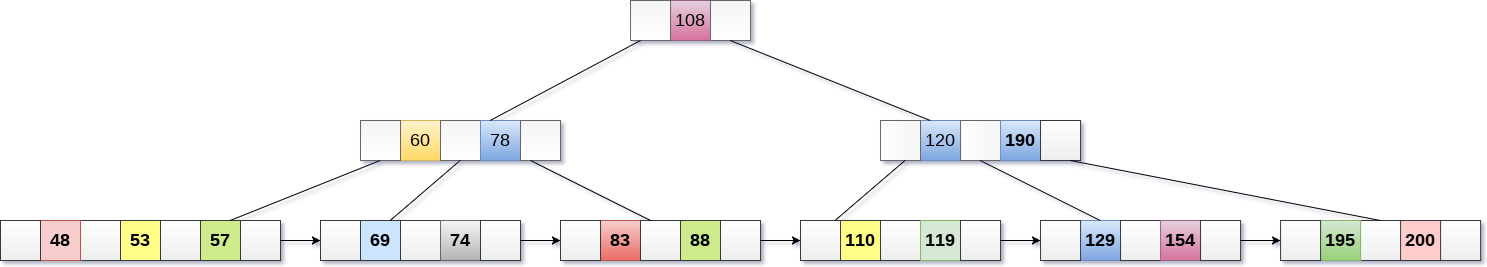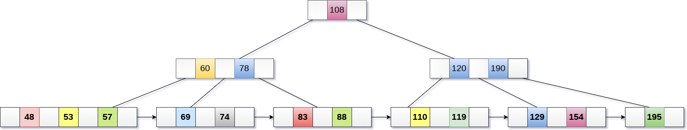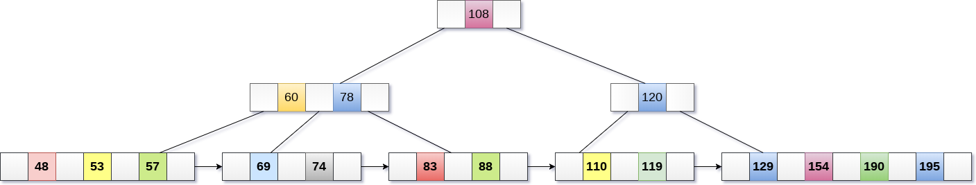 - 现在,索引节点包含6个子节点和5个键,违反B+树属性,因此需要将其拆分,如下所示。将108提为根节点。60,78左子节点,120,190右子节点。