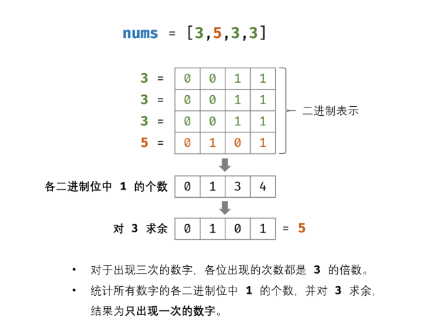 - 将 countscounts 各元素对 33 求余,则结果为 “只出现一次的数字” 的各二进制位。