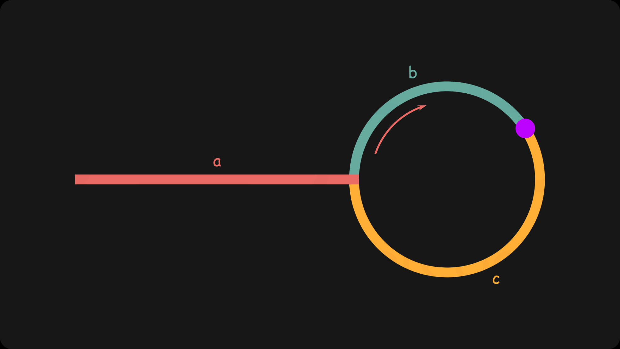 如下图所示,设链表中环外部分的长度为 a。$\textit{slow}$ 指针进入环后,又走了 b 的距离与 $\textit{fast}$相遇。此时,$\textit{fast}$ 指针已经走完了环的 n 圈,因此它走过的总距离为 $a+n(b+c)+b=a+(n+1)b+nc$。