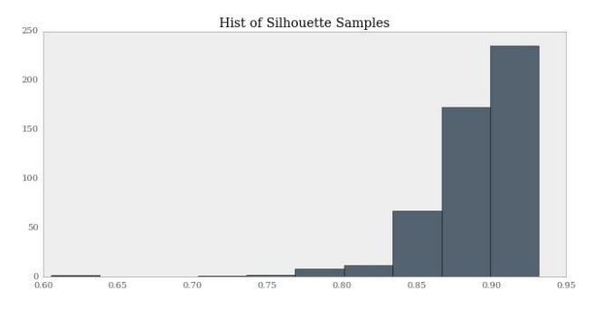 首先,我们查看轮廓(Silhouette)距离。轮廓距离是簇内不相似性、最近的簇间不相似性、以及这两个值最大值的比值。它可以看做簇间分离程度的度量。