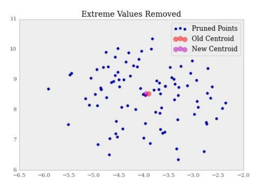 显然,形心没有移动多少,仅仅移除五个极端点时,我们的预期就是这样。这个过程可以重复,知道我们对数据表示满意。