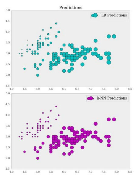 再次观察绘图,Setosa 物种(左上方的簇)被线性回归估计过高,但是 KNN 非常接近真实值。