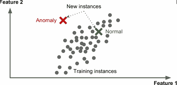 另一个重要的非监督任务是异常检测(anomaly detection) —— 例如,检测异常的信用卡转账以防欺诈,检测制造缺陷,或者在训练之前自动从训练数据集去除异常值。异常检测的系统使用正常值训练的,当它碰到一个新实例,它可以判断这个新实例是像正常值还是异常值(图 1-10)。