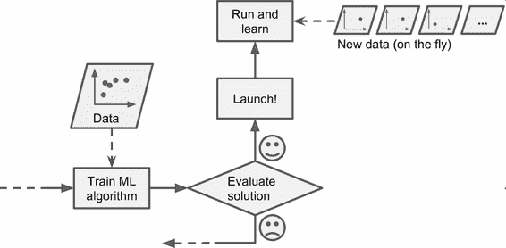 幸运的是,训练、评估、部署一套机器学习的系统的整个过程可以自动进行(见图 1-3),所以即便是批量学习也可以适应改变。只要有需要,就可以方便地更新数据、训练一个新版本。