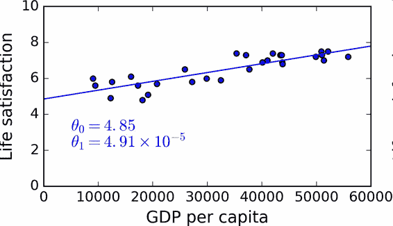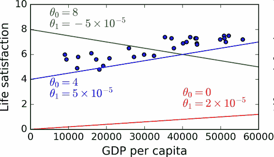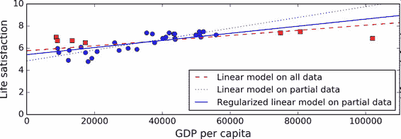 图 1-23 展示了三个模型:虚线表示用一些缺失国家的数据训练的原始模型,短划线是我们的第二个用所有国家训练的模型,实线模型的训练数据和第一个相同,但进行了正则化限制。你可以看到正则化强制模型有一个小的斜率,它对训练数据的拟合不是那么好,但是对新样本的推广效果好。