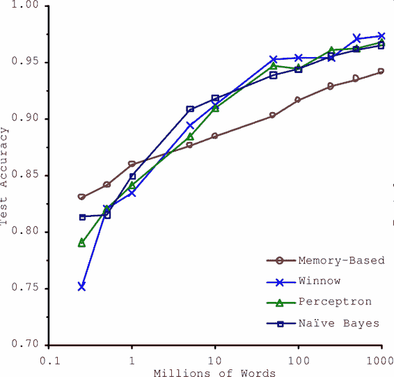 在一篇 2001 年发表的著名论文中,微软研究员 Michele Banko 和 Eric Brill 展示了不同的机器学习算法,包括非常简单的算法,一旦有了大量数据进行训练,在进行去除语言歧义的测试中几乎有相同的性能(见图 1-20)。