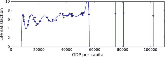 图 1-22 展示了一个高阶多项式生活满意度模型,它大大过拟合了训练数据。即使它比简单线性模型在训练数据上表现更好,你会相信它的预测吗?