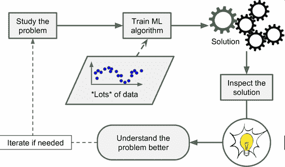 最后,机器学习可以帮助人类进行学习(图 1-4):可以检查机器学习算法已经掌握了什么(尽管对于某些算法,这样做会有点麻烦)。例如,当垃圾邮件过滤器被训练了足够多的垃圾邮件,就可以用它列出垃圾邮件预测值的单词和单词组合列表。有时,可能会发现不引人关注的关联或新趋势,有助于对问题更好的理解。