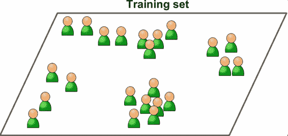 在非监督学习中,你可能猜到了,训练数据是没有加标签的(图 1-7)。系统在没有老师的条件下进行学习。