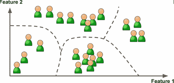 例如,假设你有一份关于你的博客访客的大量数据。你想运行一个聚类算法,检测相似访客的分组(图 1-8)。你不会告诉算法某个访客属于哪一类:它会自己找出关系,无需帮助。例如,算法可能注意到 40% 的访客是喜欢漫画书的男性,通常是晚上访问,20% 是科幻爱好者,他们是在周末访问等等。如果你使用层次聚类分析,它可能还会细分每个分组为更小的组。这可以帮助你为每个分组定位博文。