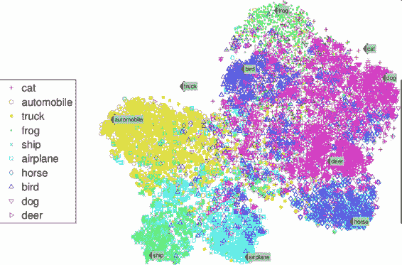 图 1-9 t-SNE 可视化案例,突出了聚类(注:注意动物是与汽车分开的,马和鹿很近、与鸟距离远,以此类推)