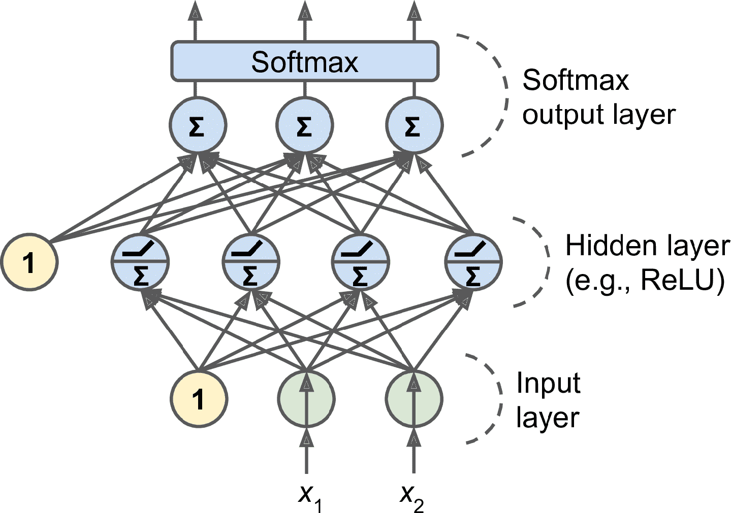 如果每个实例只能属于一个类,但可能是三个或多个类中的一个(比如对于数字图片分类,可以是类 0 到类 9),则每一类都要有一个输出神经元,整个输出层(见图 10-9)要使用 softmax 激活函数。softmax 函数可以保证,每个估计概率位于 0 和 1 之间,并且各个值相加等于 1。这被称为多类分类。