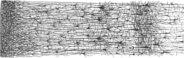 独立的生物神经元就是这样工作的,但因为神经元是处于数十亿神经元的网络中的,每个神经元都连着几千个神经元。简单神经元的网络可以完成高度复杂的计算,就好像蚂蚁齐心协力就能建成复杂的蚁冢一样。生物神经网络(BNN)如今仍是活跃的研究领域,人们通过绘制出了部分大脑的结构,发现神经元分布在连续的皮层上,尤其是在大脑皮质上(大脑外层),见图 10-2。