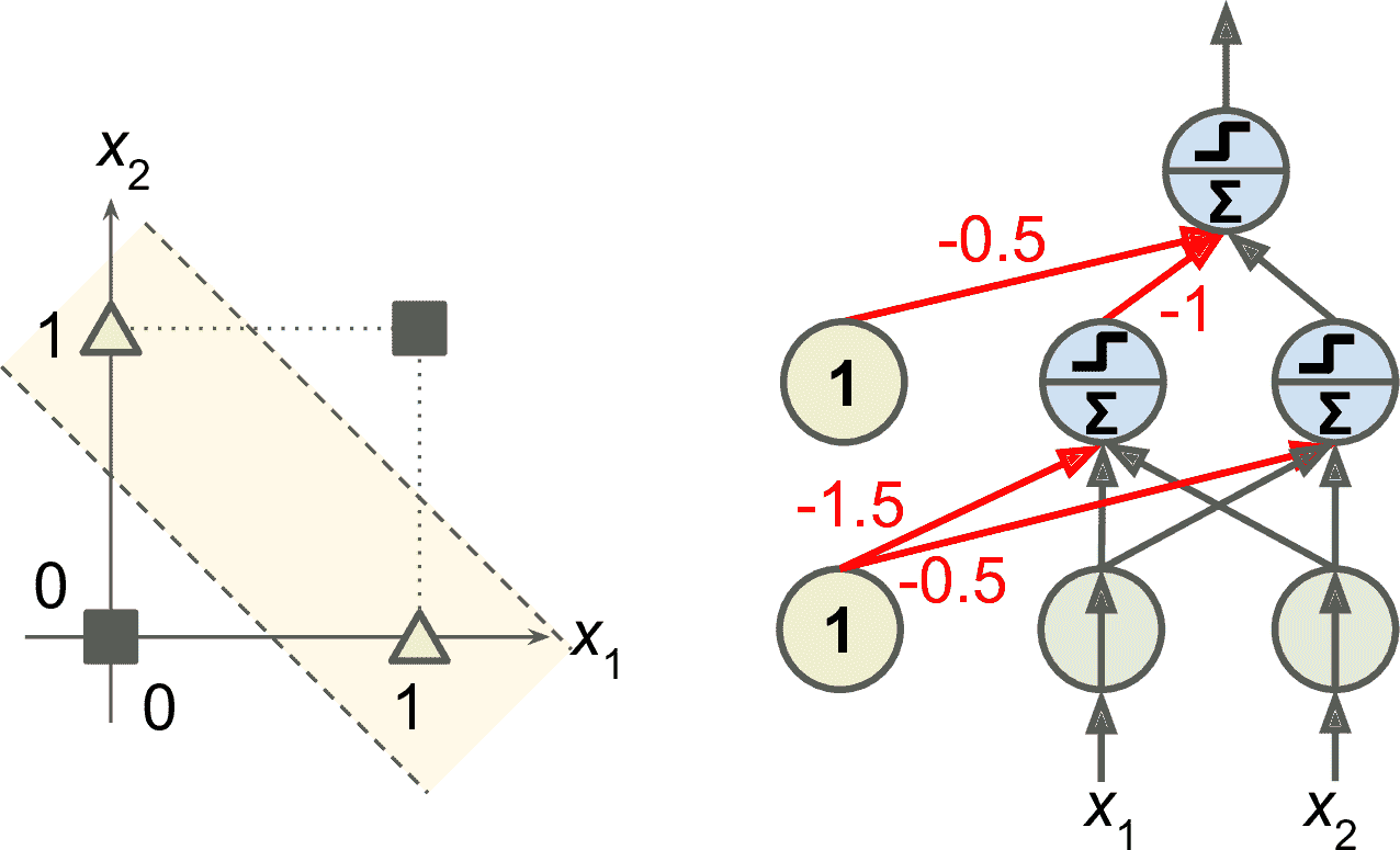 在 1969 年题为“感知机”的专著中,Marvin Minsky 和 Seymour Papert 强调了感知器的许多严重缺陷,特别是它们不能解决一些琐碎的问题(例如,异或(XOR)分类问题);参见图 10-6 的左侧)。当然,其他的线性分类模型(如 Logistic 回归分类器)也都实现不了,但研究人员期望从感知器中得到更多,他们的失望是很大的,导致许多人彻底放弃了神经网络,而是转向高层次的问题,如逻辑、问题解决和搜索。