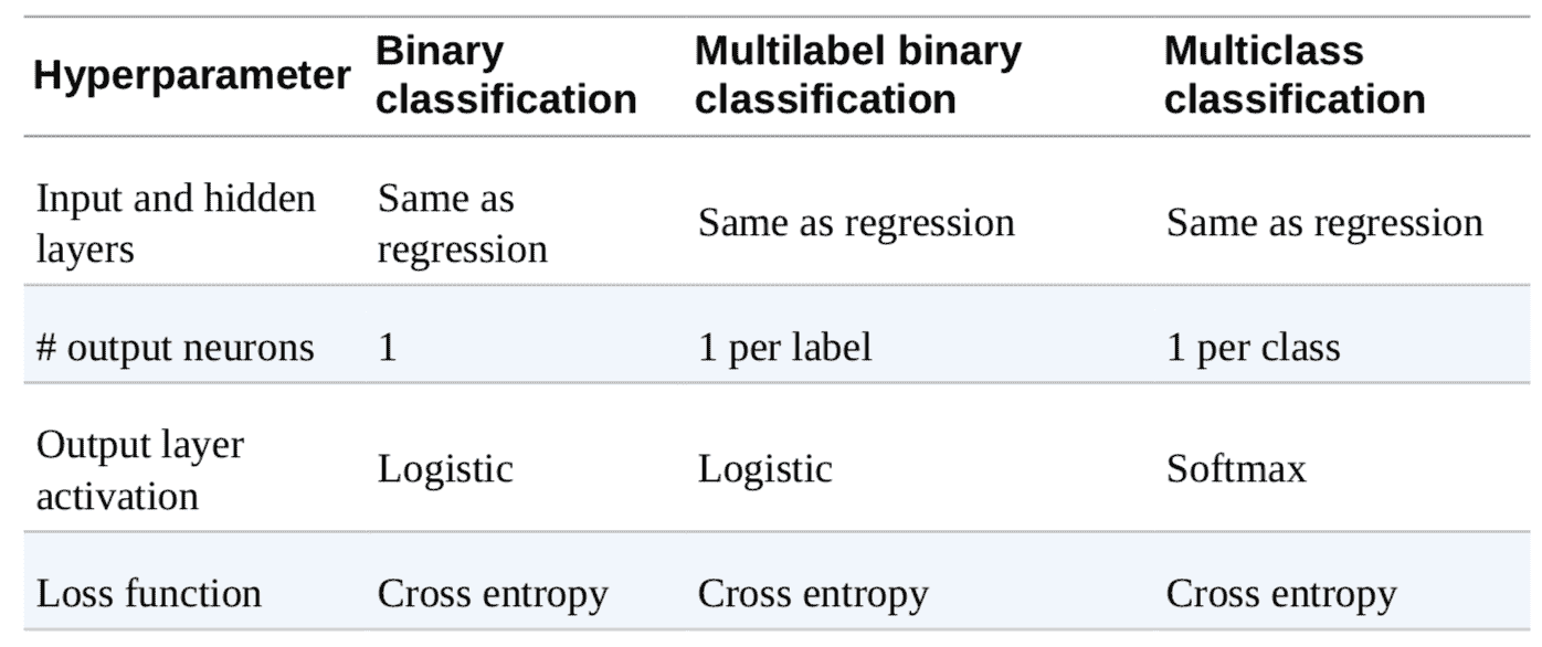 MLP 也可以处理多标签二元分类(见第 3 章)。例如,邮件分类系统可以预测一封邮件是垃圾邮件,还是正常邮件,同时预测是紧急,还是非紧急邮件。这时,就需要两个输出神经元,两个都是用 Logistic 函数:第一个输出垃圾邮件的概率,第二个输出紧急的概率。更为一般的讲,需要为每个正类配一个输出神经元。多个输出概率的和不一定非要等于 1。这样模型就可以输出各种标签的组合:非紧急非垃圾邮件、紧急非垃圾邮件、非紧急垃圾邮件、紧急垃圾邮件。