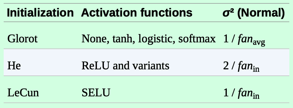 1 | keras.layers.Dense(10, activation="relu", kernel_initializer="he_normal") |