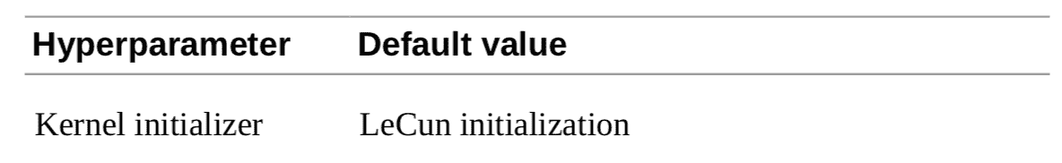 每个隐藏层的权重必须是 LeCun 正态初始化的。在 Keras 中,要设置