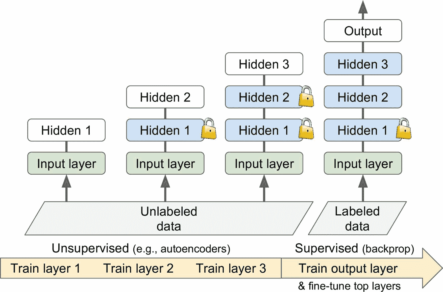 在本章中,我们将依次讨论这些问题,并给出解决问题的方法。 我们将从梯度消失/爆炸问题开始,并探讨解决这个问题的一些最流行的解决方案。 接下来会介绍迁移学习和无监督预训练,这可以在即使标注数据不多的情况下,也能应对复杂问题。然后我们将看看各种优化器,可以加速大型模型的训练。 最后,我们将浏览一些流行的大型神经网络正则化方法。