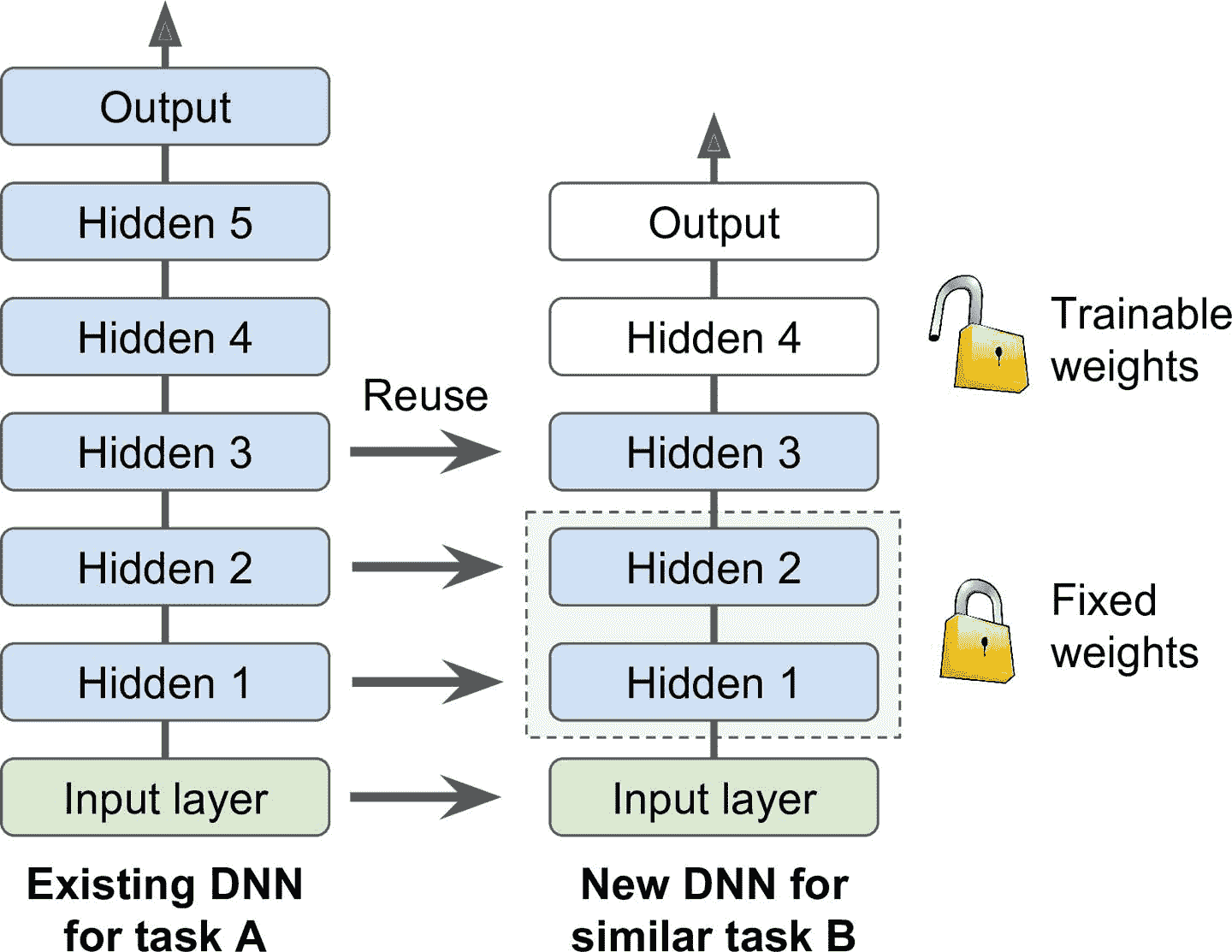 从零开始训练一个非常大的 DNN 通常不是一个好主意,相反,您应该总是尝试找到一个现有的神经网络来完成与您正在尝试解决的任务类似的任务(第 14 章会介绍如何找),然后复用这个网络的较低层:这就是所谓的迁移学习。这样不仅能大大加快训练速度,还将需要更少的训练数据。