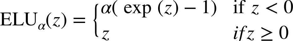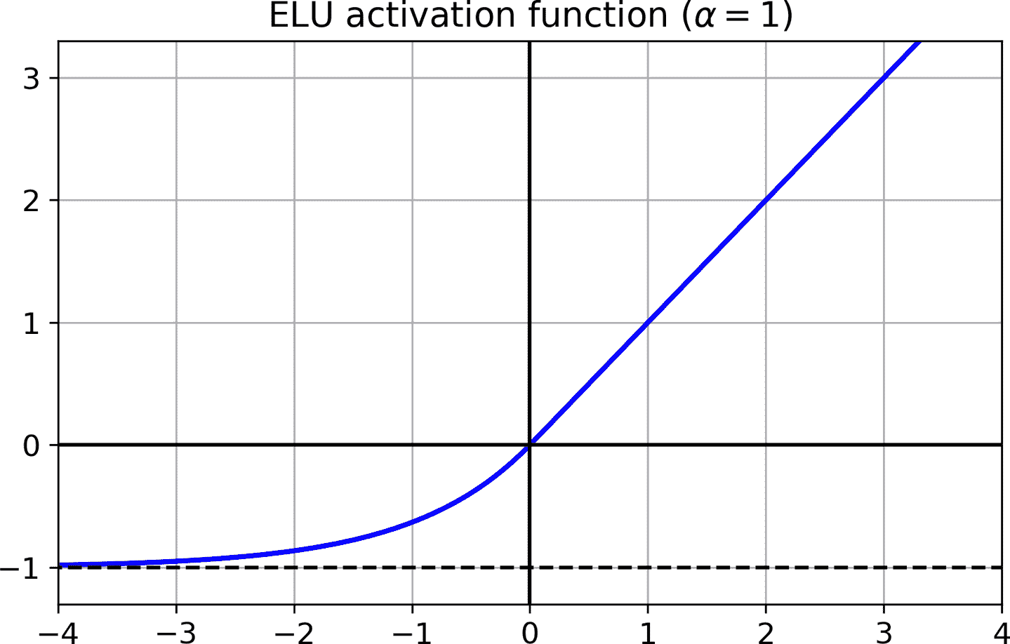 最后,Djork-Arné Clevert 等人在 2015 年的一篇论文中提出了一种称为指数线性单元(exponential linear unit,ELU)的新激活函数,在他们的实验中,ELU 的表现优于所有 ReLU 变体:训练时间减少,神经网络在测试集上表现的更好。 如图 11-3 所示,公式 11-2 给出了它的定义。