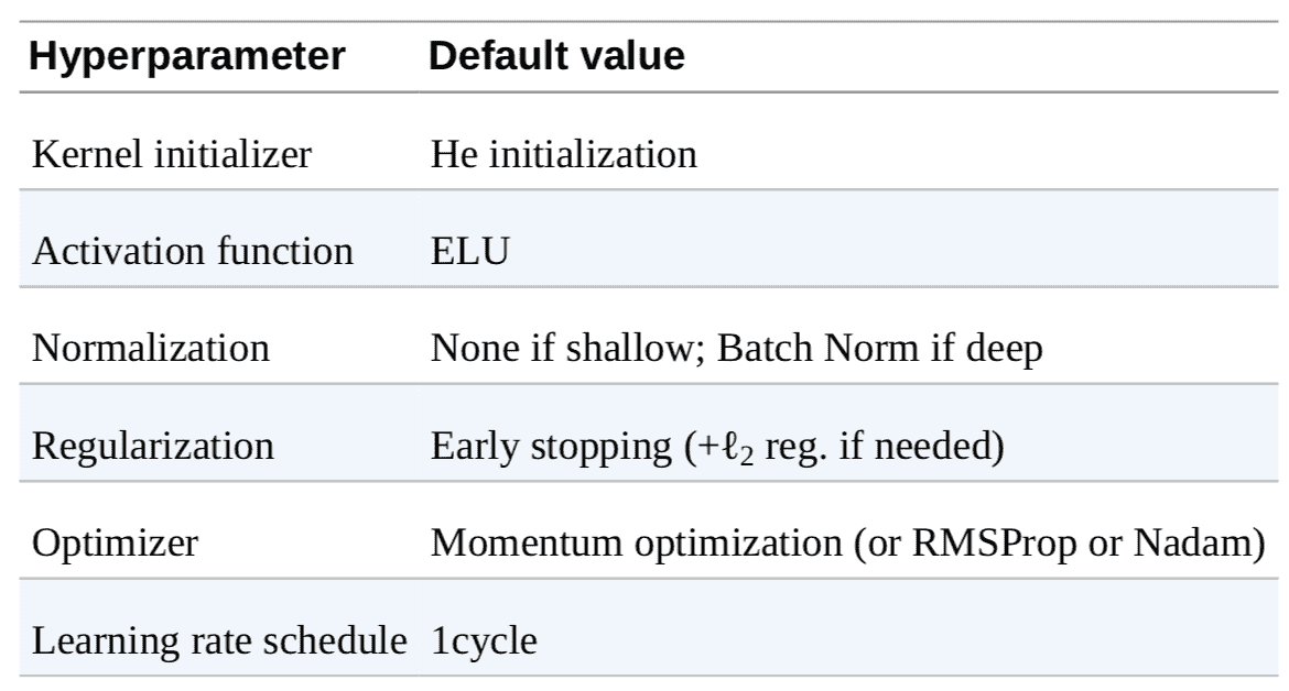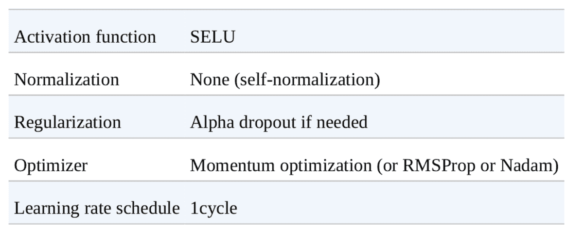 如果网络只有紧密层,则可以是自归一化的,可以使用表 11-4 的配置。