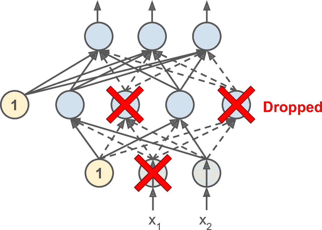这是一个相当简单的算法:在每个训练步骤中,每个神经元(包括输入神经元,但不包括输出神经元)都有一个暂时“丢弃”的概率p,这意味着在这个训练步骤中它将被完全忽略, 在下一步可能会激活(见图 11-9)。 超参数p称为丢弃率,通常设为 10% 到 50% 之间;循环神经网络之间接近 20-30%,在卷积网络中接近 40-50%。 训练后,神经元不会再丢失。 这就是全部(除了我们将要讨论的技术细节)。