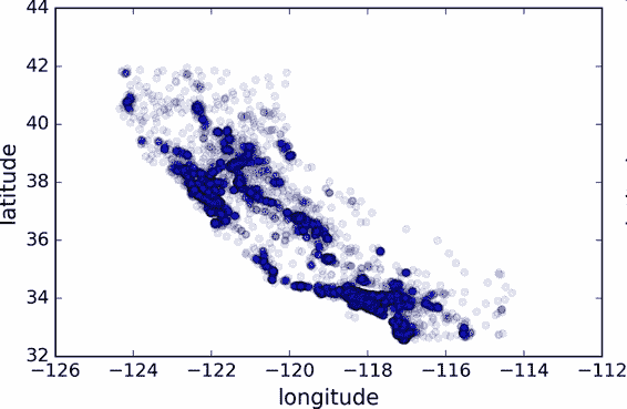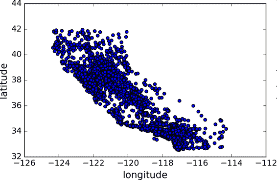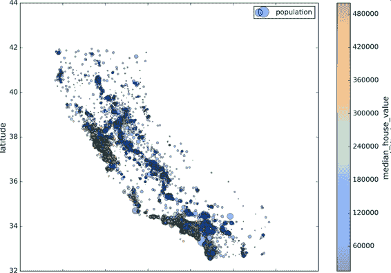 本章,我们选择的是 StatLib 的加州房产价格数据集(见图 2-1)。这个数据集是基于 1990 年加州普查的数据。数据已经有点老(1990 年还能买一个湾区不错的房子),但是它有许多优点,利于学习,所以假设这个数据为最近的。为了便于教学,我们添加了一个类别属性,并除去了一些。