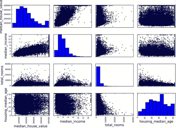 有了这个信息,你就可以丢弃一些不那么重要的特征(比如,显然只要一个ocean_proximity的类型(ISLAND)就够了,所以可以丢弃掉其它的)。