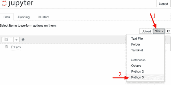 Jupyter 服务器现在运行在终端上,监听 8888 端口。你可以用浏览器打开http://localhost:8888/,以访问这个服务器(服务器启动时,通常就自动打开了)。你可以看到一个空的工作空间目录(如果按照先前的virtualenv步骤,只包含env目录)。